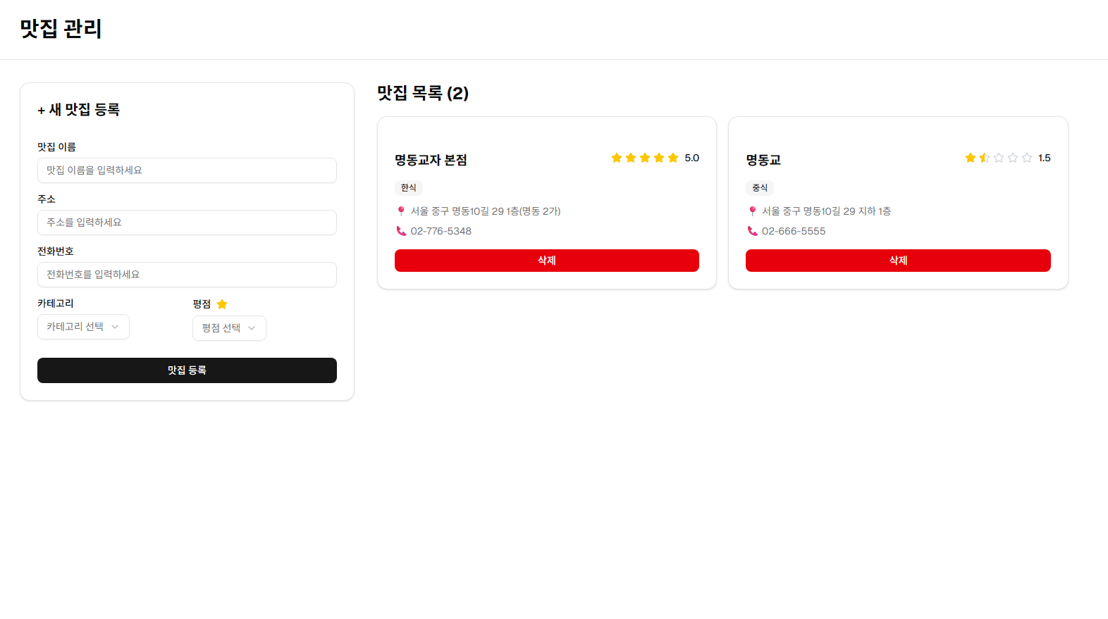 # 아래는 사용한 프롬프트 너는 숙련된 프론트엔드 개발자이자 UI 디자이너야. 아래 요구사항을 만족하는 웹 UI를 생성해. [기술 스택] - node 18.0.2 - npm, React(Vite) - TypeScript - Tailwind CSS - axios - 백엔드 연동 없음 (로컬 mock서버만 사용) [페이지 목적] - "나만의 맛집 리스트"를 관리하는 UI - 맛집 등록, 목록 조회, 삭제 기능을 프론트엔드에서만 구현 [전체 레이아웃] - 상단제목: 맛집 관리 - 좌측: 맛집 등록창 - 우측: 맛집 목록 보여주는 영역 [좌측 영역 – 맛집 등록창] 1. 카드 형태의 등록창 - 제목: "+ 새 맛집 등록" 2. 입력(세로 정렬) - 맛집 이름을 입력 받는 입력창 하나, 이 입력창의 레이블: 맛집 이름 - 주소를 입력 받는 입력창 하나, 이 입력창의 레이블: 주소 - 전화번호를 입력받는 입력창 하나, 이 입력창의 레이블: 전화번호 - 레이블이 카테고리인 select box 하나, 선택지는 한식, 중식, 일식, 양식, 기타 - 레이블이 평점인 select box 하나, 선택지는 1.0~5.0이고 노란색 별 아이콘으로 표기 4. 하단 버튼 - 텍스트: "맛집 등록" - 클릭 시 위에 입력값을 우측 영역 목록에 추가 ──────────────────── [우측 영역 – 맛집 목록] 1. 제목 - "맛집 목록 (N)" - N은 현재 등록된 맛집 수 2. 맛집 카드 UI - 카드 내부 구성: · 상단: 맛집 이름 + 오른쪽에 평점(노란색 별 아이콘으로 표기) · 카테고리는 작은 pill 형태 배지 · 주소 · 전화번호 3. 하단 버튼 - 텍스트: "삭제" - 빨간색 버튼, 흰색 폰트 - 클릭시 해당하는 맛집을 목록에서 삭제