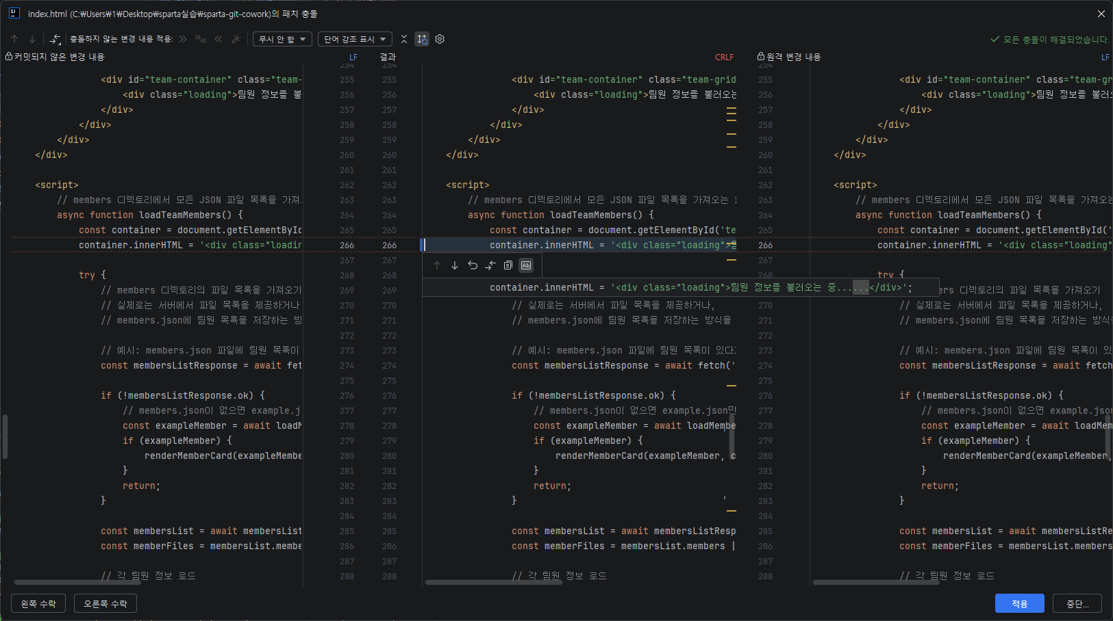 시나리오 2: JavaScript 함수 수정 충돌
