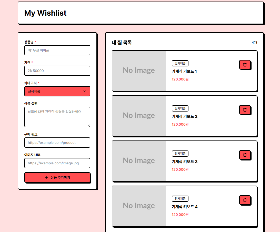또한 인텔리제이를 사용하여 바뀌지않는 html파일에 가짜 서버가 아니라 spring 서버를 연결해서 반응을 확인하고 firebase를 사용하여 데이터베이스까지 연결함으로써 나름만족스러운 위시리스트를 완성할수있었다.