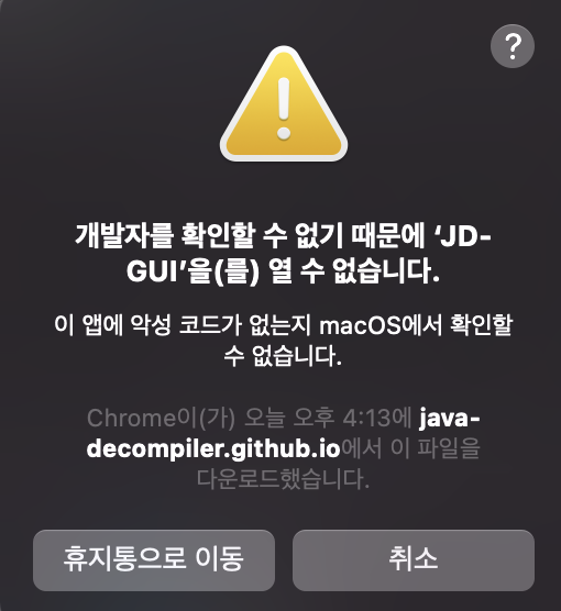 Mac은 보안을 굉장히 신경써주기 때문에 아래처럼 바로 쓰레기통에 버려주려고 한다...