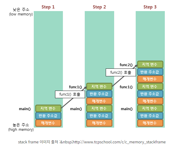 함수를 call하는 것은 함수를 곧 스택 영역에 올리는 것인데 예를 들어서, 재귀 함수 같은 경우에서 내부적으로 함수를 무한히 부르게 되면 stack이 넘쳐나서 stack frame을 벗어나는 상황이 발생하는데 이를 stack overflow라고 한다.