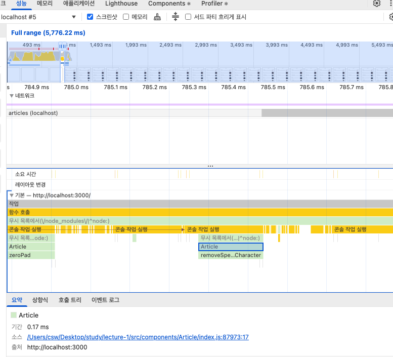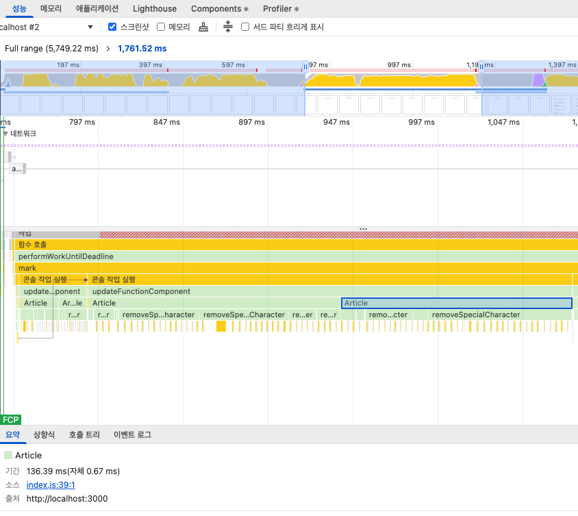 Article이라는 컴포넌트를 사용하고, 그 안에 removeSpecialCharacter() 라는 마크다운의 특수문자를 지워주는 함수를 기존에 사용하고 있었고, 과도한 비효율적 반복문으로 Article의 컴포넌트 렌더링 속도가 매우 지연되고있음을 보여준다.