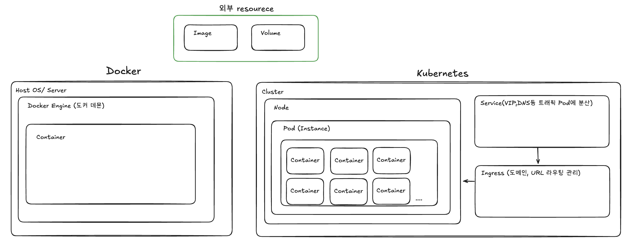 | Cluster | 여러 대의 도커 엔진을 모아놓은 Swarm(덜 쓰임) | 여러 노드로 구성된 하나의 큰 관리단위. 쿠버네티스의 핵심 | 클러스터 전체에서 Pod/Service/Ingress 등 모든 리소스가 실행·관리됨 |
