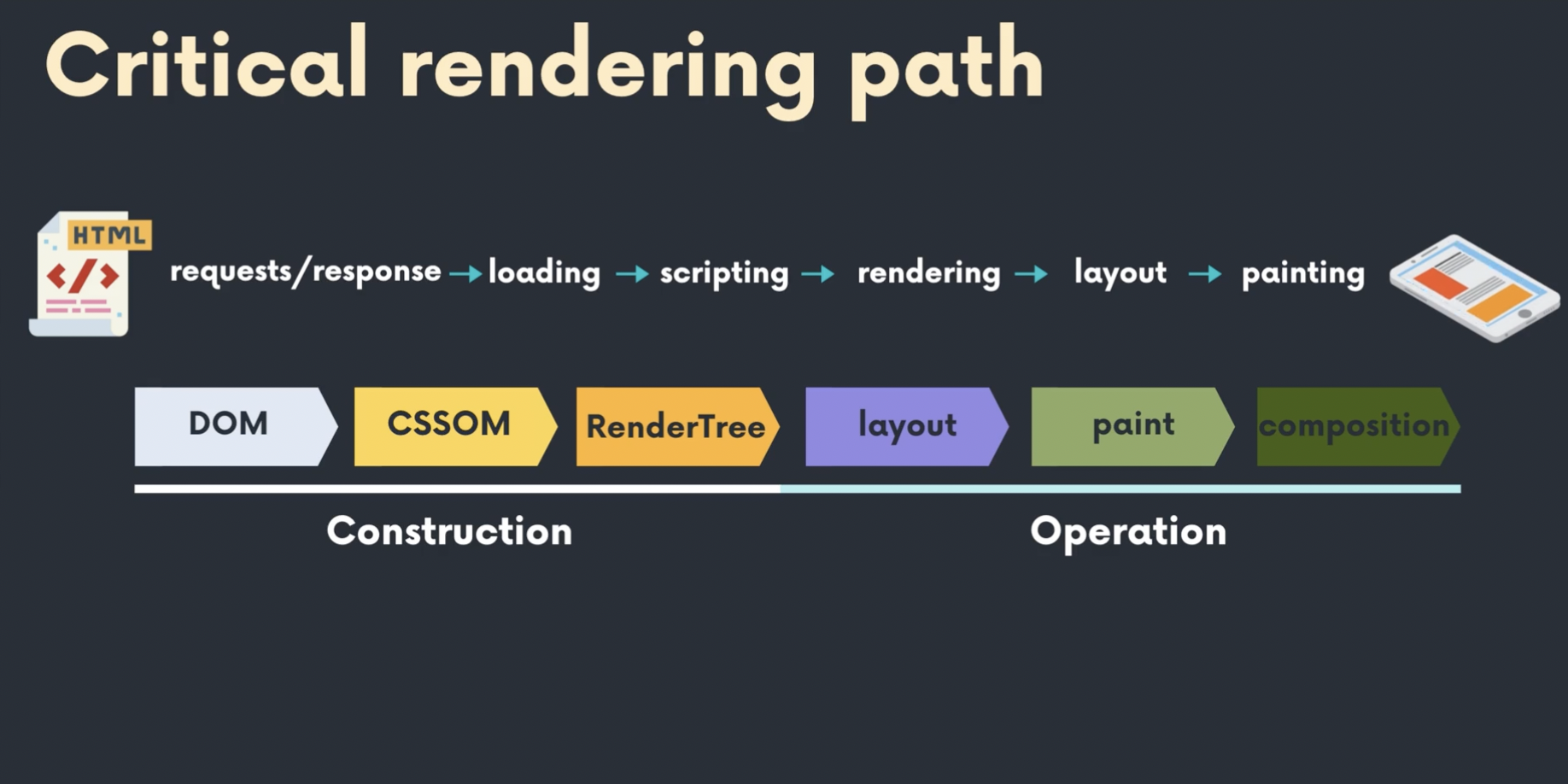 scripting 까지의 과정을 construction, 그 이후를 operation이라고 부른다. Rendering Tree를 만들고(contruction), 그걸 그려주는 과정이 크게 layout, paint, composition 과정이다.