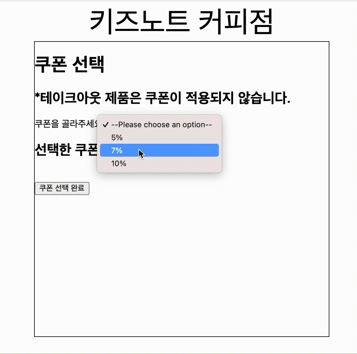 아무것도 고르지 않고 "쿠폰선택 완료" 버튼을 누를 시, alert창으로 알려준다.