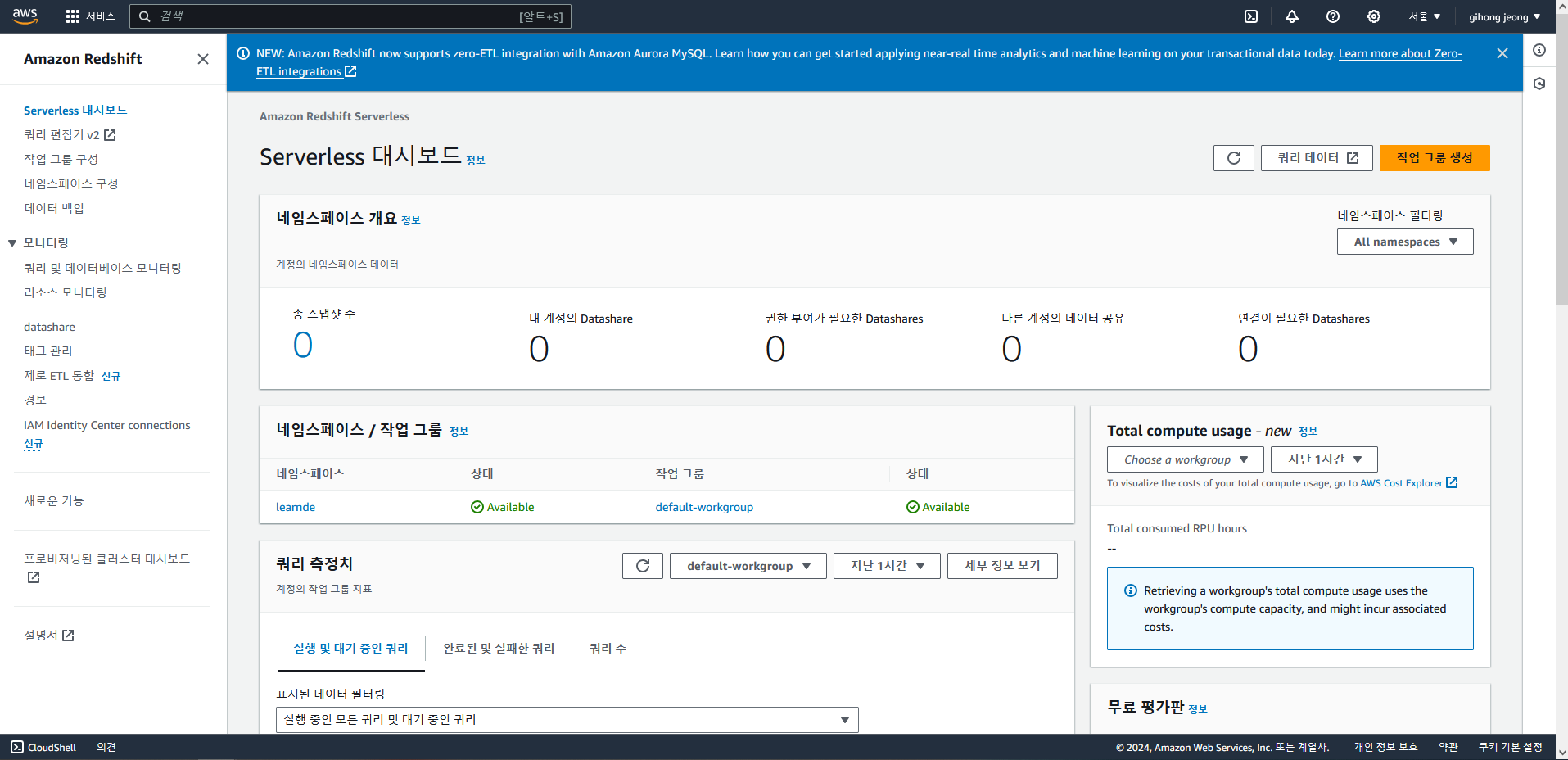 먼저 AWS Management Console을 이용하여 Redshift 대시보드를 만들어줍니다. (학습을 위한 무료 Serverless를 사용하였습니다.)