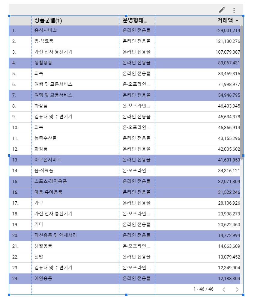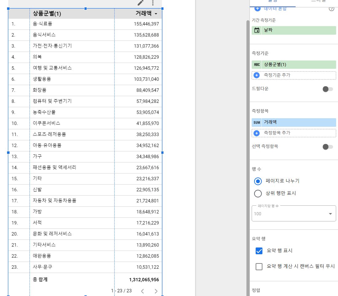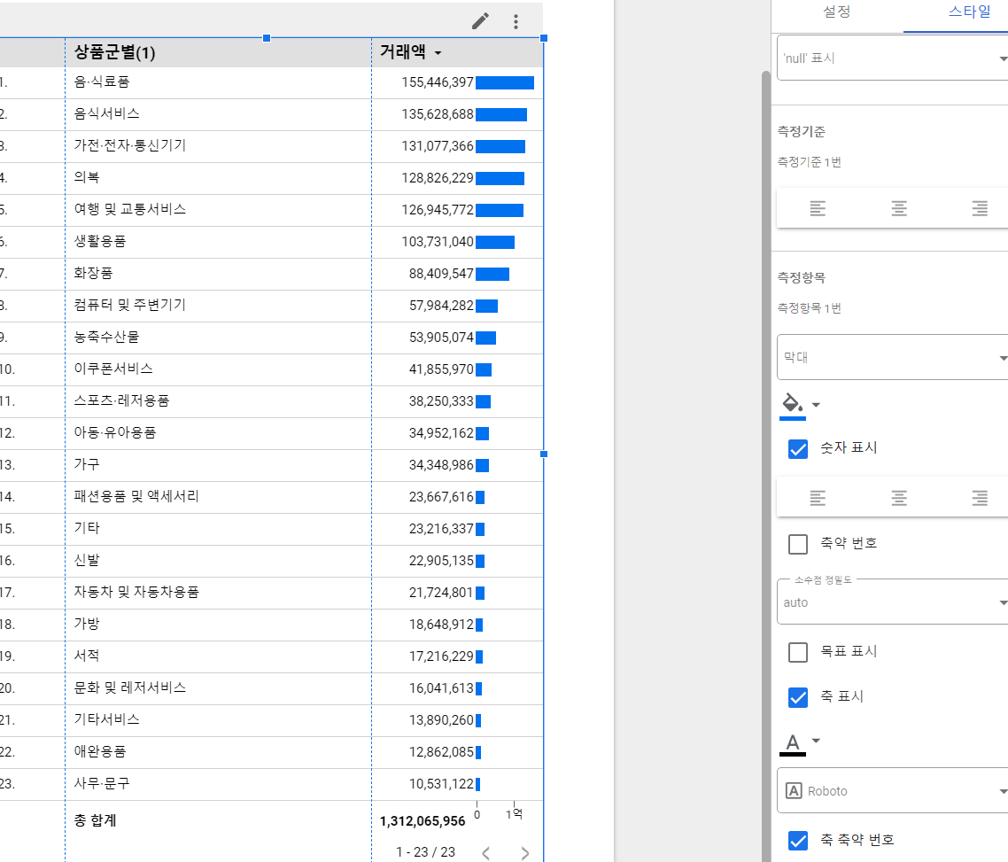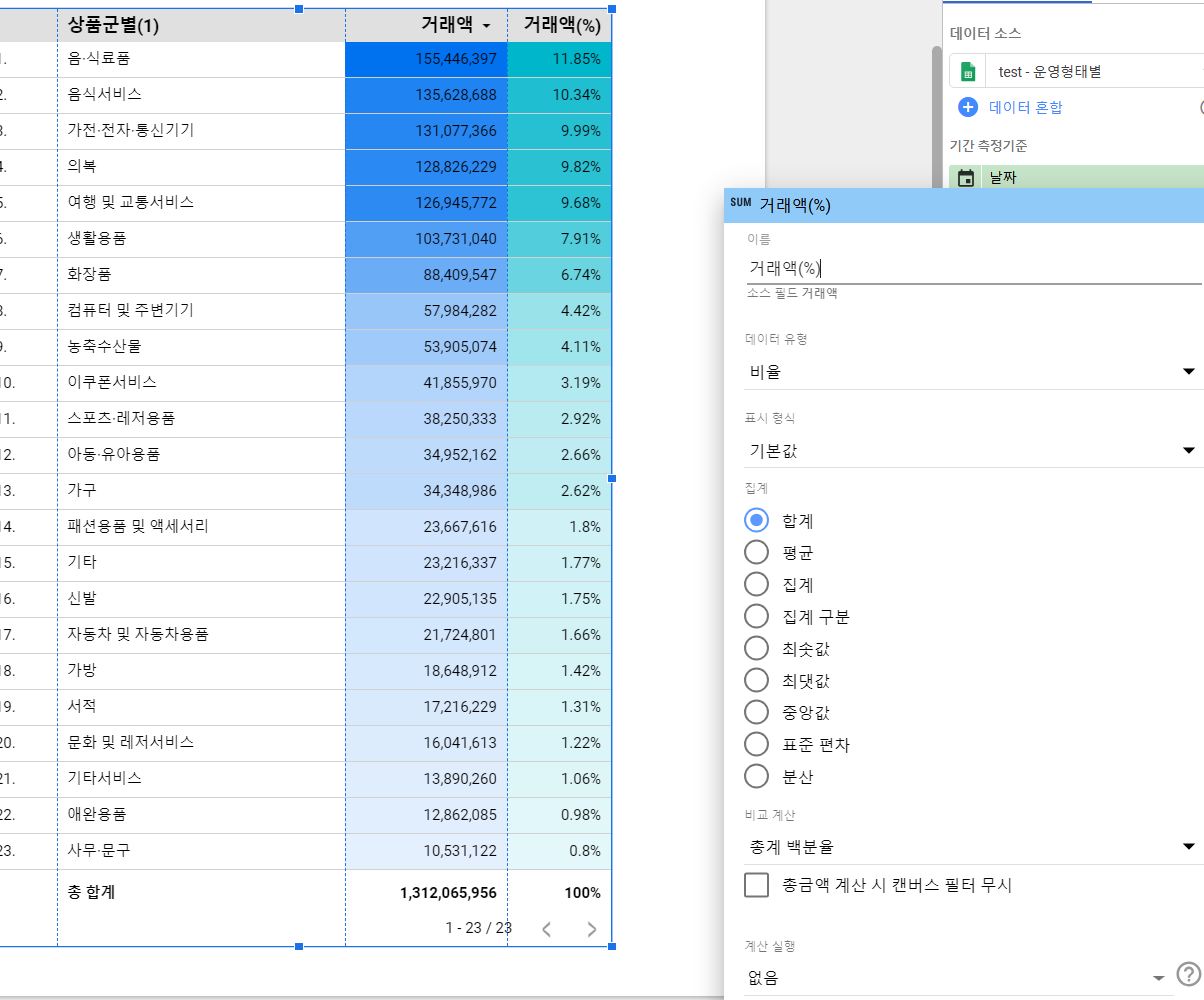전체 거래액에서 차지하는 비율을 표시하고 싶다면 거래액을 측정항목으로 추가하고 SUM모양을 누르게 되면 밑에 사진처럼 뜨게 되는데 비교 계산에 총계 백분율을 클릭하면됩니다.