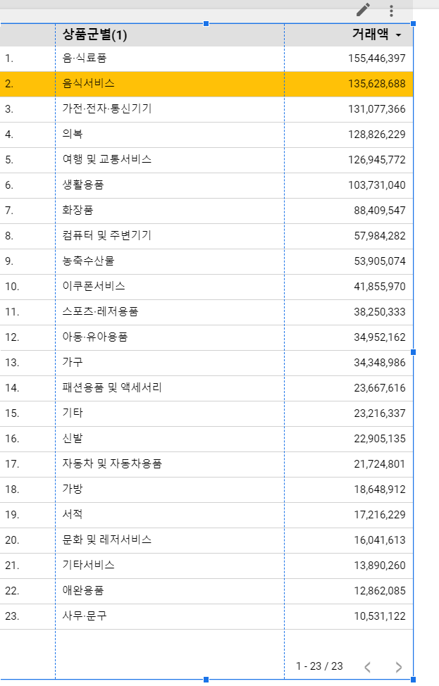 상품군별 기준으로 포함 조건인 음식 값일때 주황색으로 표에 표시하도록 하겠습니다.