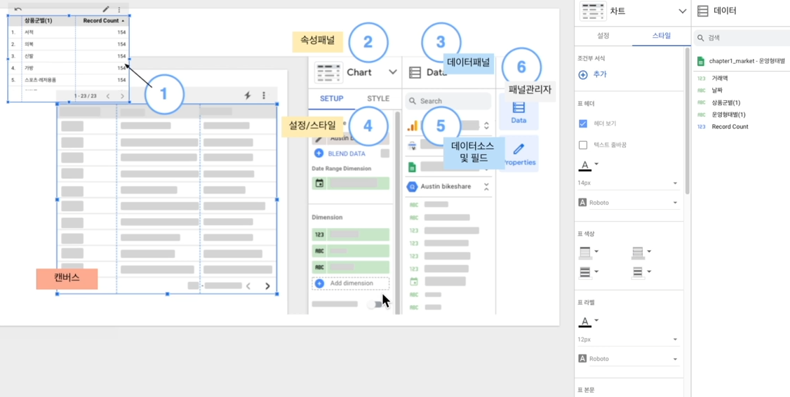 캔버스 영역(1): 캔버스는 보고서의 메인 작업 공간으로, 데이터 시각화의 모든 요소(표, 그래프, 차트 등)가 표시되는 영역입니다.