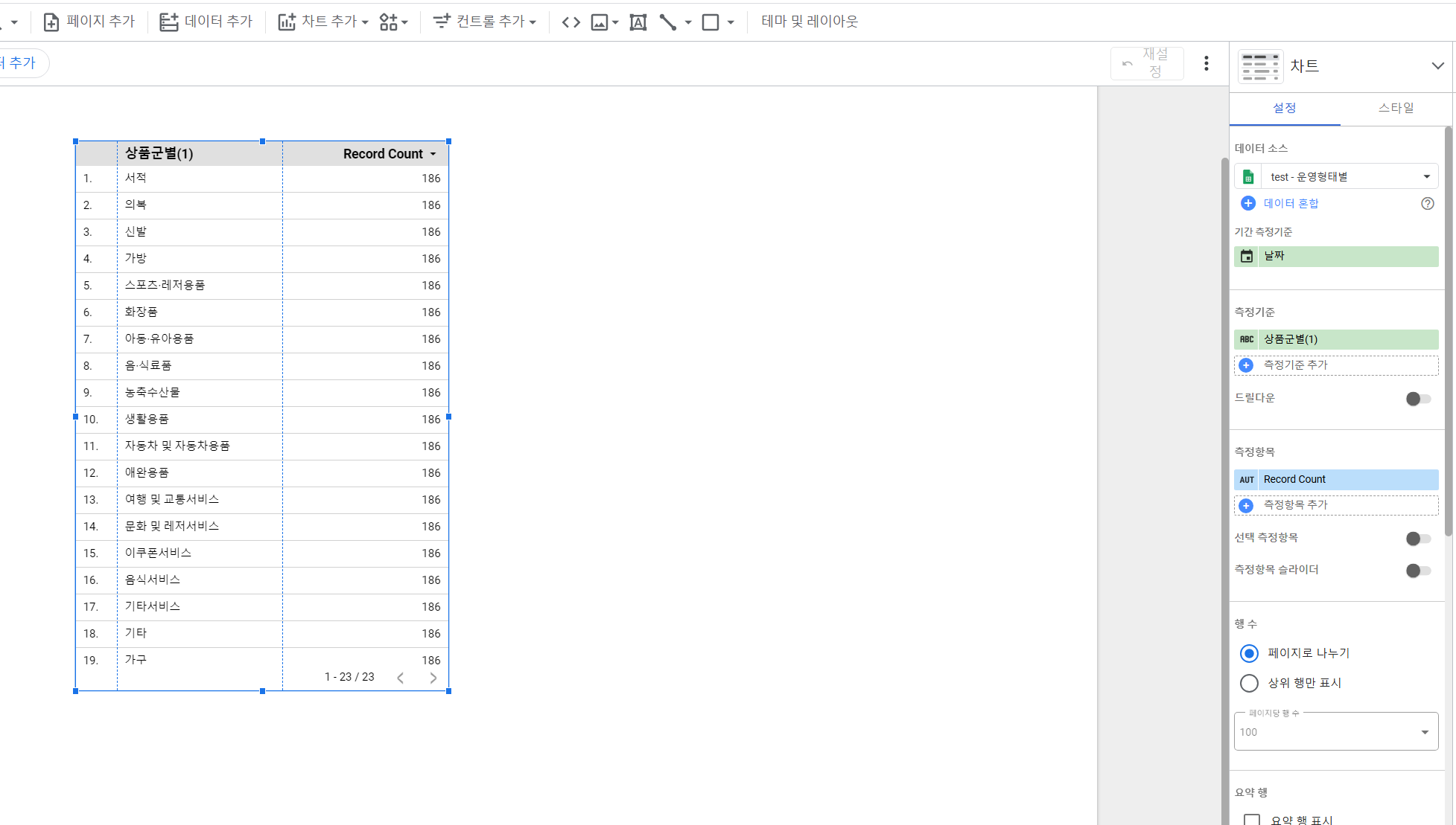 에서는 선택한 시각화 요소(표, 차트)에 포함될