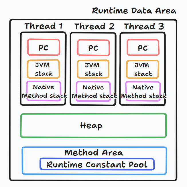 런타임 데이터 영역은 크게 Method Area, Heap Area, Stack Area, PC Register, Native Method Stack으로 나눌 수 있다.
