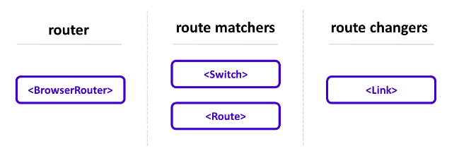 React Router 주요 컴포넌트로는 라우터(Router)역할을 하는 BrowserRouter와 경로를 매칭(Route Matchers)해주는 Switch와 Route 경로를 변경(Route Changers)하는 역할을 하는 Link가 존재한다.