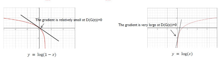 그러나 D(G(z))가 0에 가까울 때(학습 초반, 생성자(G)가 상당히 형편 없을 때), 이 로그 함수의 기울기가 0에 가까워져 학습이 느려집니다.