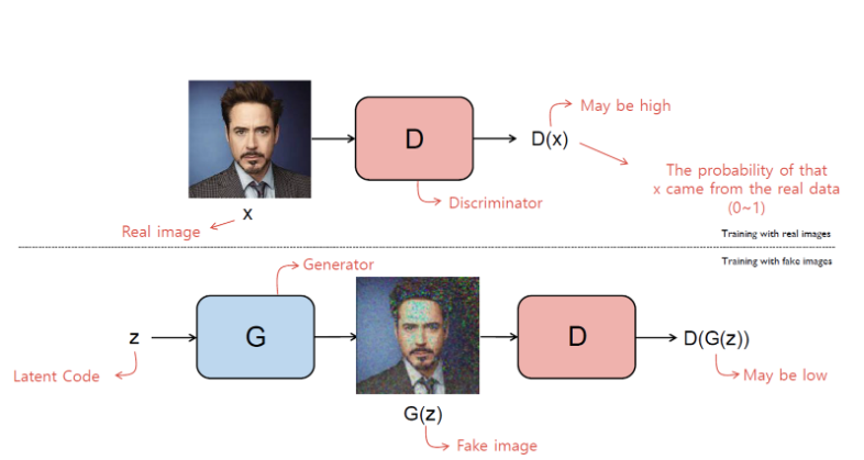 - 판별자(D): 입력된 데이터가 실제 데이터인지 생성자가 만든 가짜 데이터인지를 구분하려고 합니다.