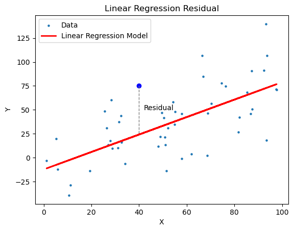 Linear Regression에서 종속 변수는 관찰의 결과인 확률변수이기 때문에, 오차(error)를 포함합니다. 오차를 알기 위해서는, 모델링을 위한 인자와 종속 변수 간의 모든 경우의 수를 학습해야하지만, 현실적으로 불가능하기에 Linear Regression에서는 오차를 사용하지 않고, 표본집단(학습데이터)으로 학습된 모델의 예측값과 실제 관측값 사이의 차이인 잔차(residual) 개념을 사용합니다.