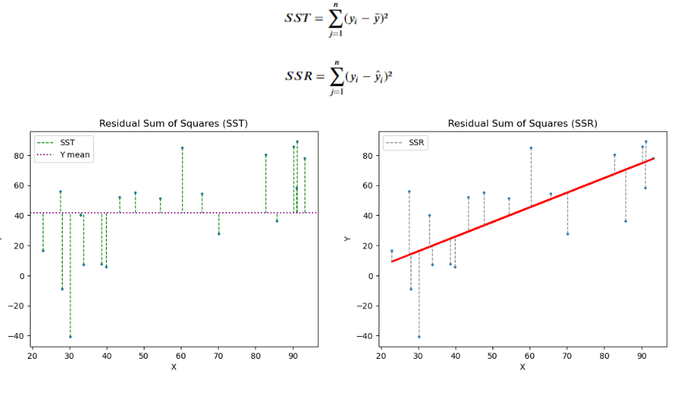 잔차 제곱합이 작다는 것은 실제 값과 회귀 모델로 예측한 값의 차이가 작음을 의미하며 오차가 작을수록 선형 회귀 모델이 데이터를 잘 표현한다고 볼 수 있습니다.