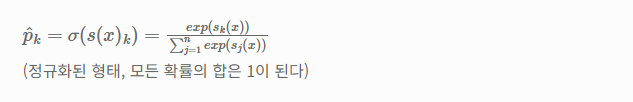 각 클래스의 점수를 소프트맥스 함수를 통과시켜 클래스 k에 대한 확률 클래스 k에 대한 확률 p를 추정합니다.