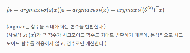 샘플 가 주어지면, 소프트맥스 회귀 모델이 각 클래스 k에 대한 점수 를 계산합니다.