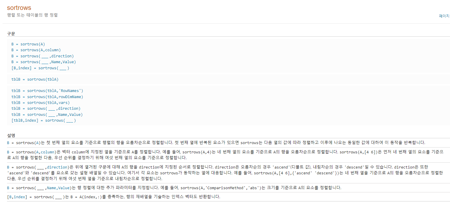 * Reference : https://kr.mathworks.com/help/matlab/ref/double.sortrows.html