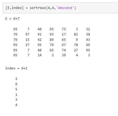 [B,index] = sortrows(...)를 이용하면 행의 정렬한 순서를 index 열벡터를 통하여 확인할 수 있습니다. 예를 들어 [E,index] = sortrows(A,4,'descend') 를 실행시키면,