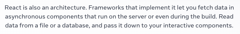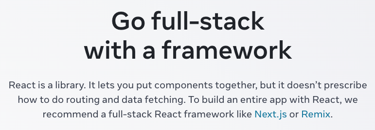 위 이미지는 React.js 공식 홈페이지에서 React를 소개하는 글이다. "React is a library." 공식 홈페이지에서 못 박았다. React는 library라고. React.js는 component들을 모아 웹 개발을 도와주지만, 웹에서 가장 중요한 것들인 data fetching과 routing에 대해서 어떻게 해야 하는지 규정하고 있지 않기 때문에 React는 library다.
