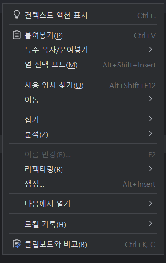 인텔리제이에서 마우스 우클릭 후