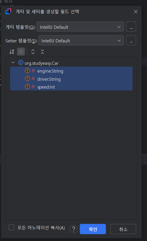 그리고 만들고 싶은 member변수들을 클릭한 후 확인을 누르면