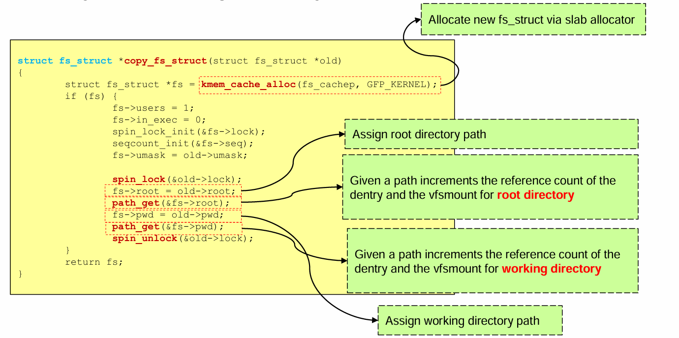 fs_struct 구조체를 생성한다.fs_struct 내용을 child의 것으로 복사한다.CLONE_FS flag를 사용하면 복사하지 않고, 구조체를 공유하며 reference count를 증가시킨다.sighand_struct
