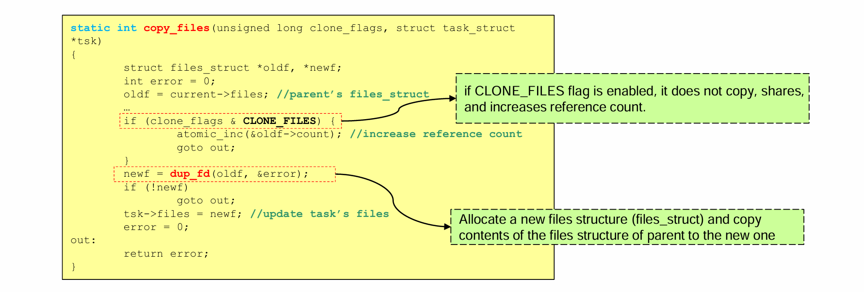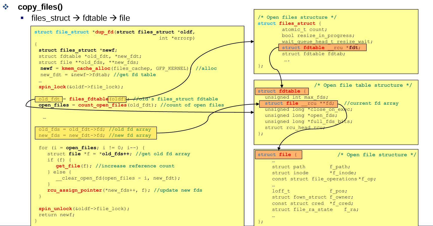 files_struct : process 단위 open filesfdtable : fd 배열file : 실제 open file objectfile object 자체는 공유 (ref count 증가)copy_fs() – 파일 시스템 정보