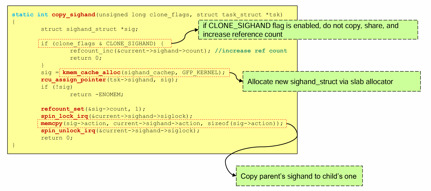 sighand_struct 구조체를 생성한다.sighand_struct 내용을 child의 것으로 복사한다.CLONE_SIGHAND flag를 사용하면 복사하지 않고, 구조체를 공유하며 reference count를 증가시킨다.signal_struct