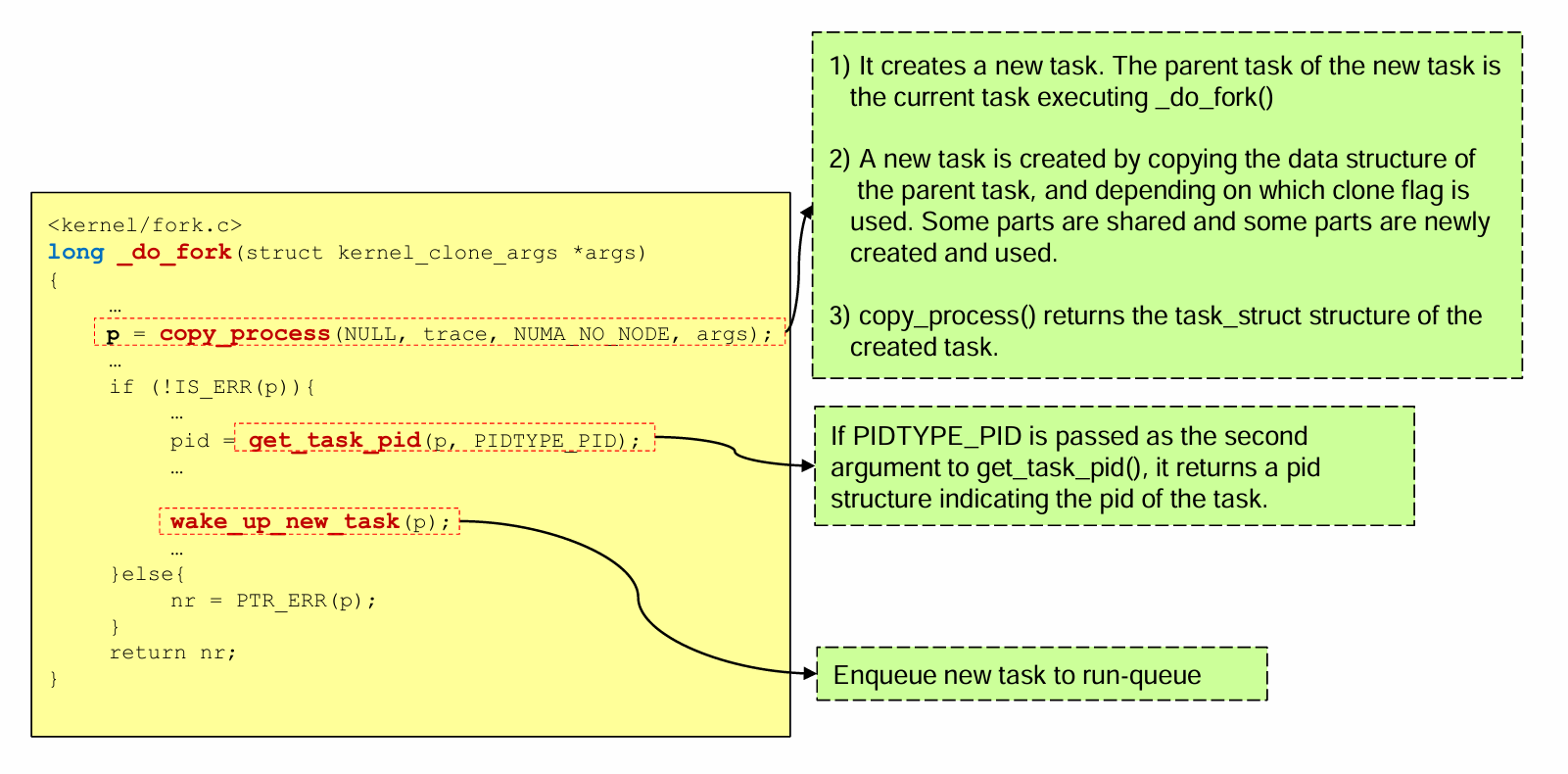 _do_fork()를 실행 중인 현재 task이다.copy_process()는 생성된 task의 task_struct 구조체를 반환한다.get_task_pid()의 두 번째 인자로 PIDTYPE_PID가 전달되면, 해당 task의 pid를 나타내는 pid 구조체를 반환한다.