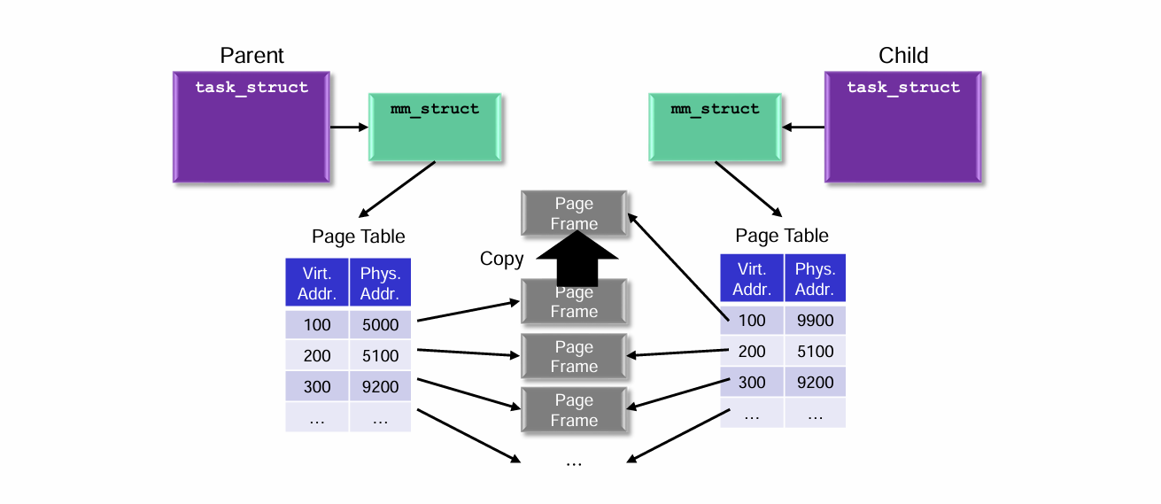 do_fork()가 호출될 때는 page frame(실제 memory 내용)는 복사하지 않고, page table만 복사