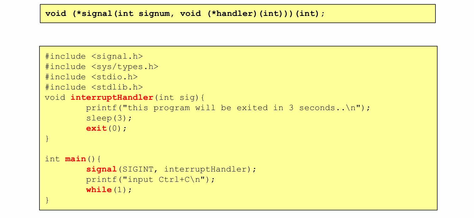 Ctrl + C를 누르면 SIGINT 발생signal(SIGINT, handler)로 custom handler 등록exit()👉 signal은 process 제어 메커니즘임