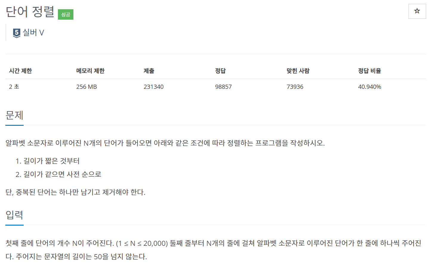 이후 정렬된 배열을 순회하면서 strcmp(arr[i], arr[i+1]) != 0 조건을 통해 중복된 단어는 출력하지 않도록 처리하였다