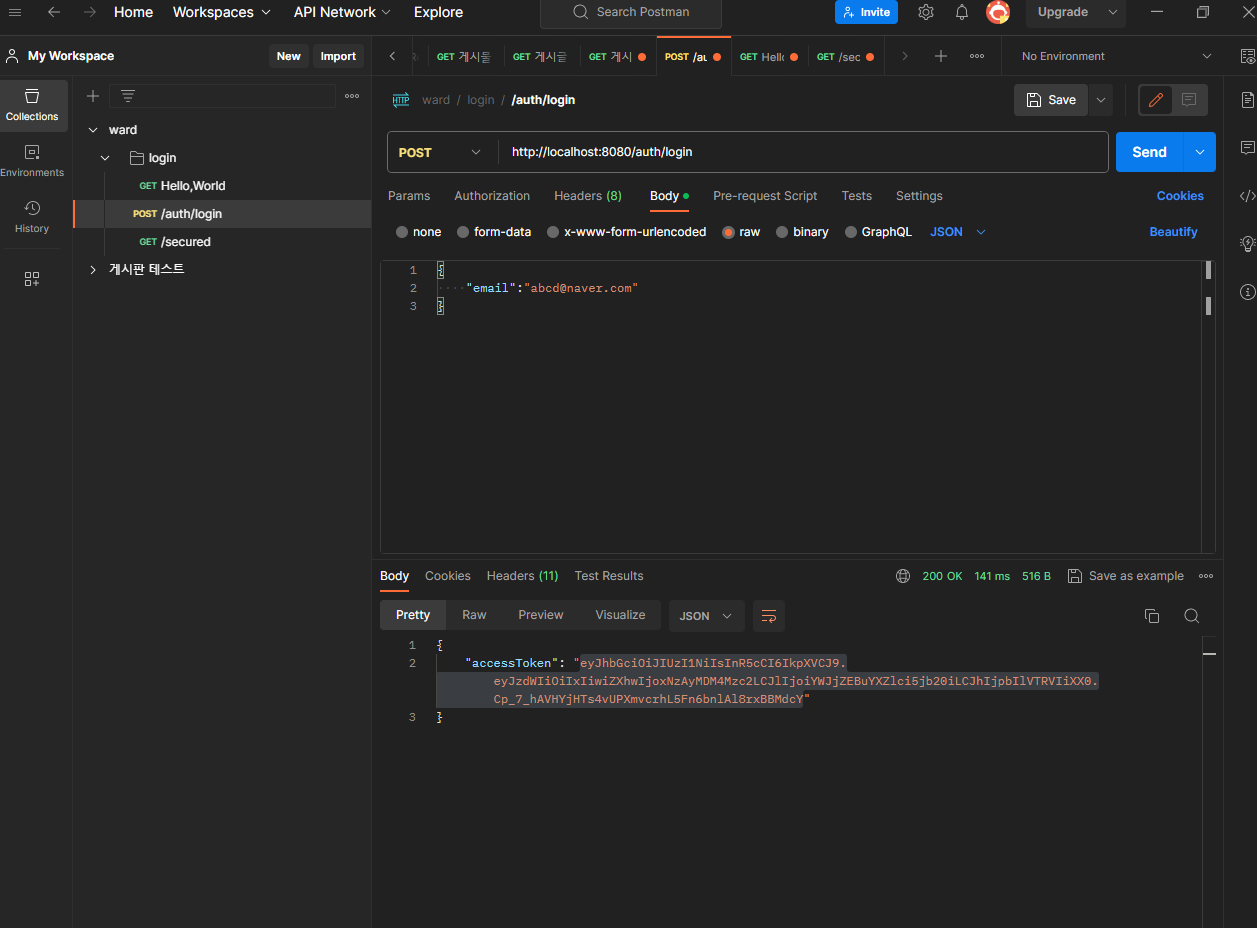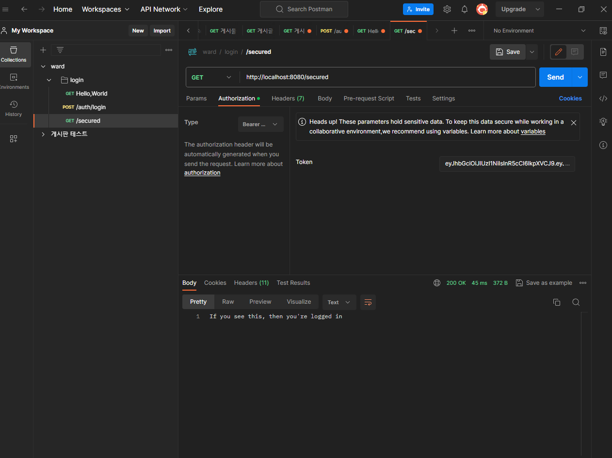 2. postman을 /login 통해 토큰 발행하고 다시 /secured 하면 원하는 결과가 나옵니다.