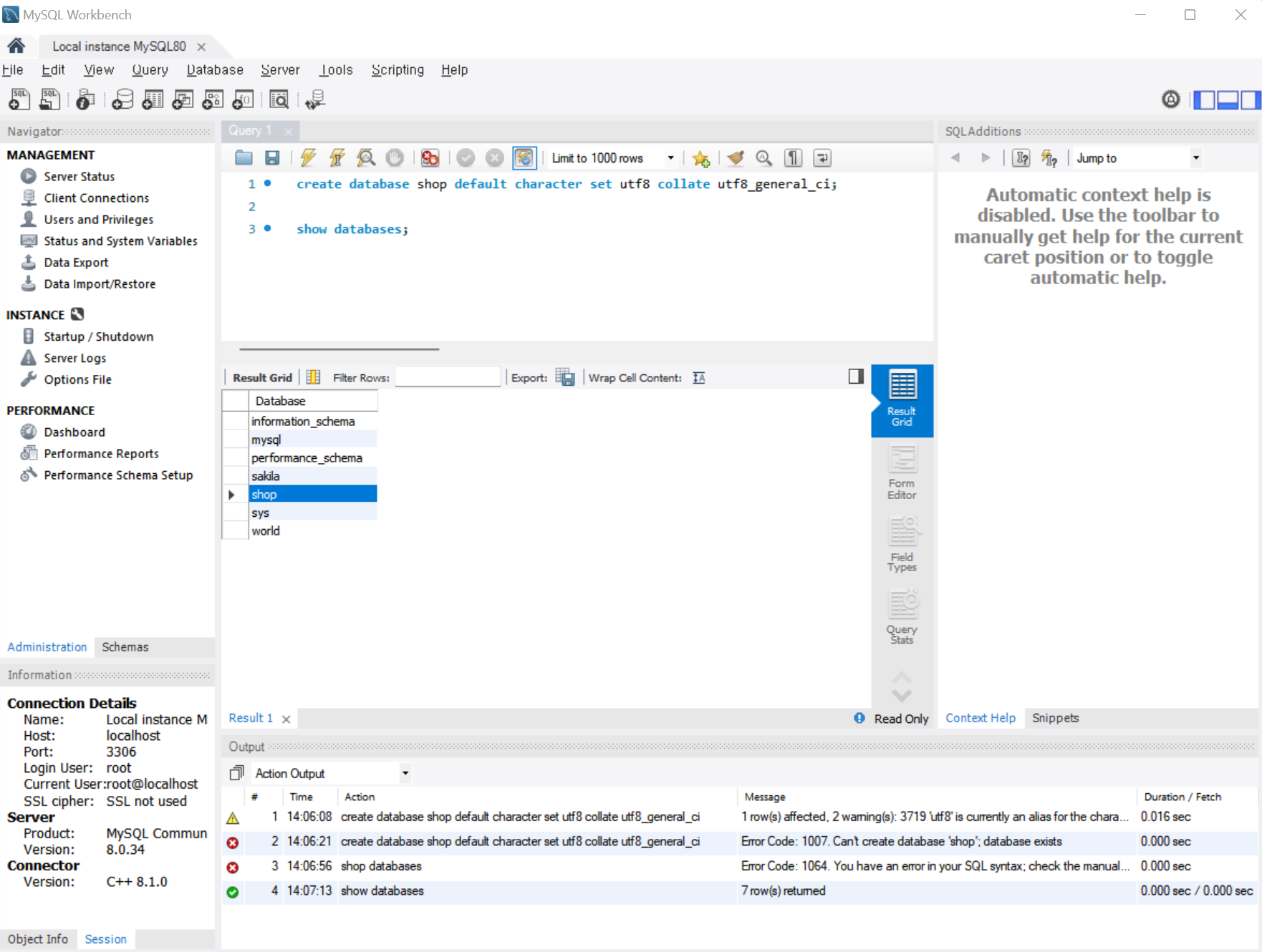 - 해당 쿼리를 작성하고 shop database를 만들었다.