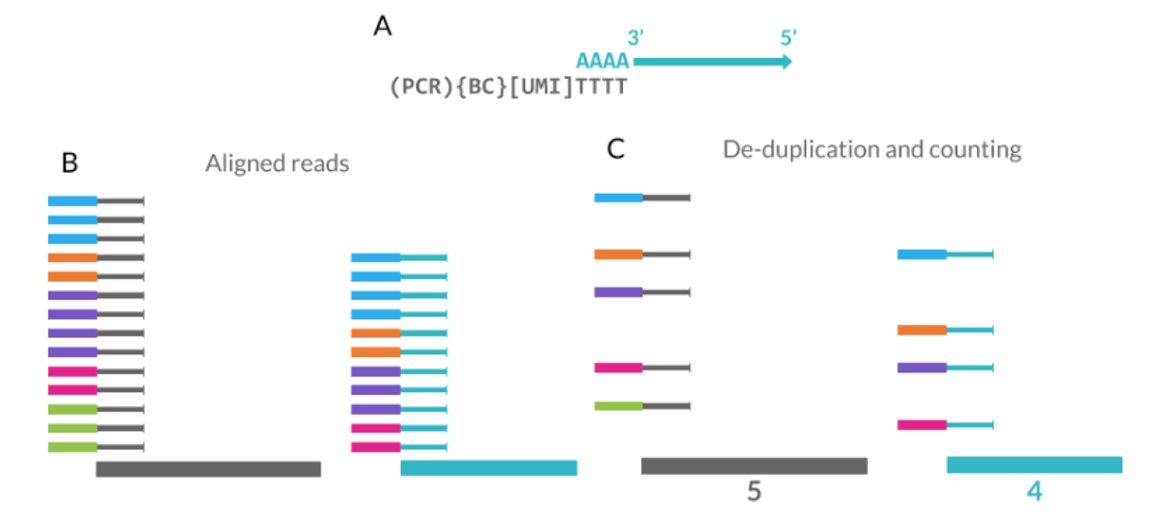 UMI는 amplification 이전에 부착되므로, De-duplication을 통해 실제 count를 관측할 수 있게 한다.