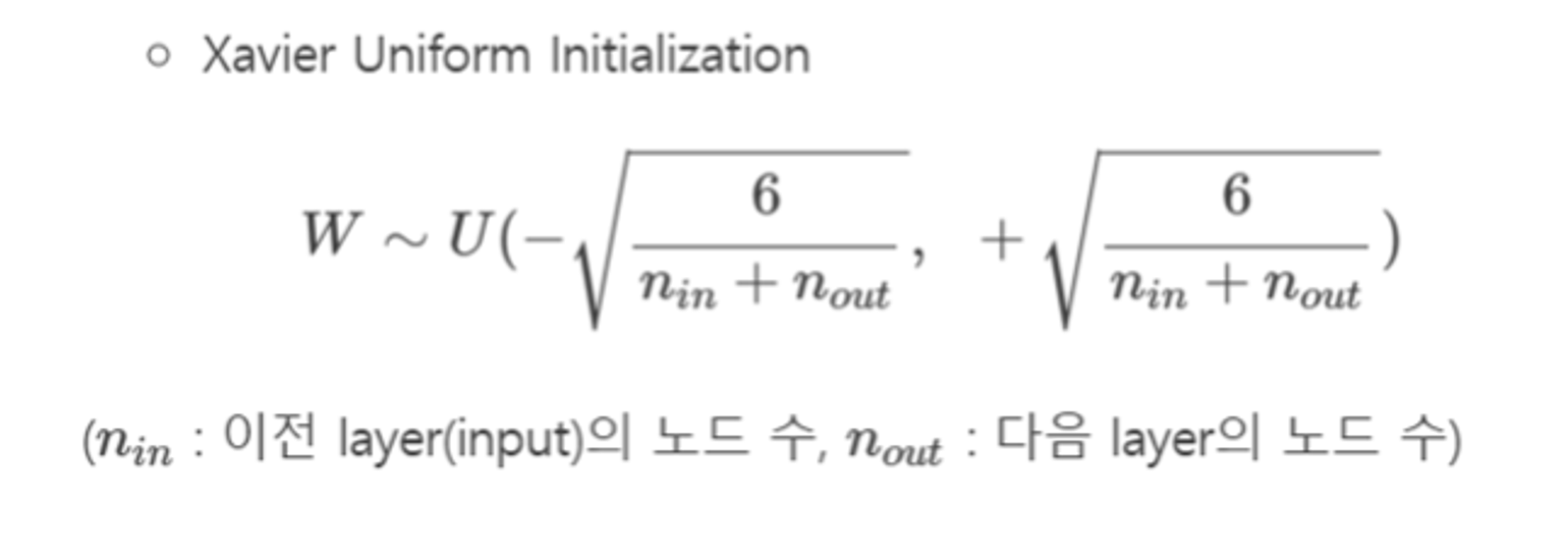 - 이를 위해서 이전 layer의 뉴런 개수와 다음 layer의 뉴런 개수를 이용하여 가중치를 초기화한다.