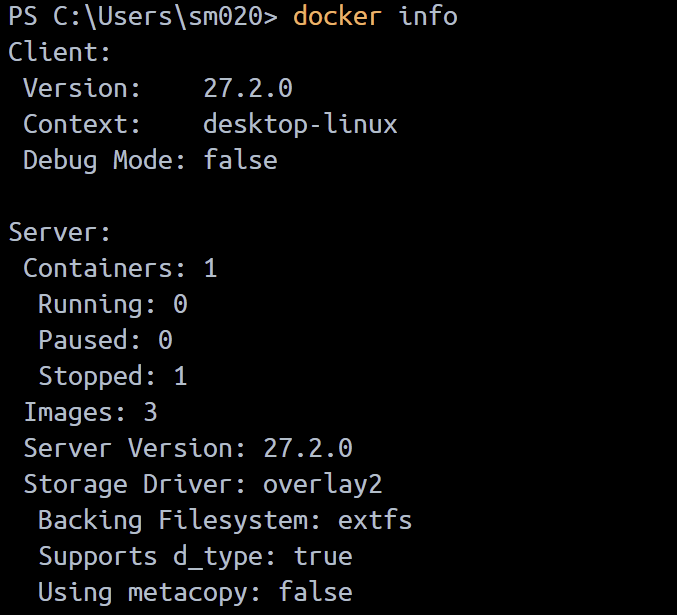 Docker를 작동 후 "docker info"와 같은 명령어로 확인을 해보면 Client와 Server로 나뉘어 설치된 것을 확인할 수 있습니다.