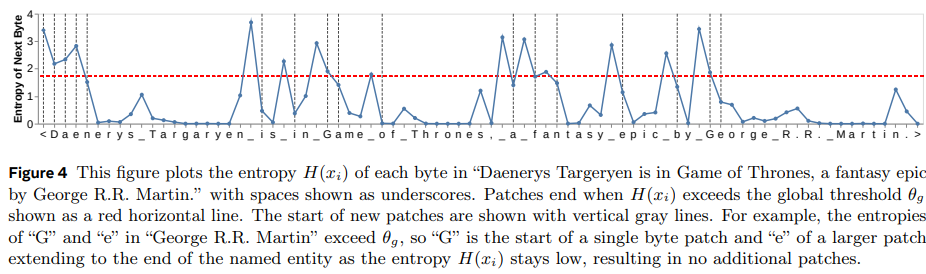 Byte를 사용해서 모델에 집어 넣는다는 생각은 매우 좋지만, Byte의 개수도 생각을 해야한다. 거의 대부분 문장을 token단위로 나누는 것보다 Byte로 나누는 개수가 훨씬 많기 때문에 모델의 연산량이 많아진다는 문제가 있다.(하나의 input당 모델 전체를 forwarding하는 것은 동일하기 때문) 이를 막기 위해 patching이라는 개념이 도입되었다.