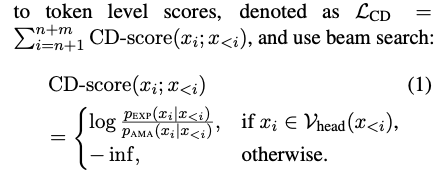 매 time step 마다 plausible token set 에 속해있는 token들에 대해서는 Expert LM과 Amateur LM의 log likelihood 값의 차이를 구해주어 CD-Score라는 term으로 표기를 하고 Beam search를 적용하였다.