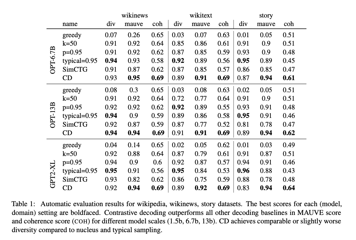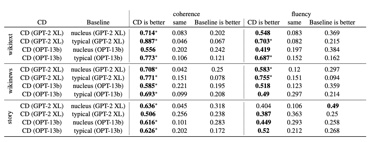 실험결과 Diversity를 제외한 모든 지표에서 Contrastive Decoding이 좋은 성능 보였습니다. 특히 Model Scale이 커질수록 Nucleus Sampling과 Contrastive Decoding의 차이가 줄어든다고 한다.