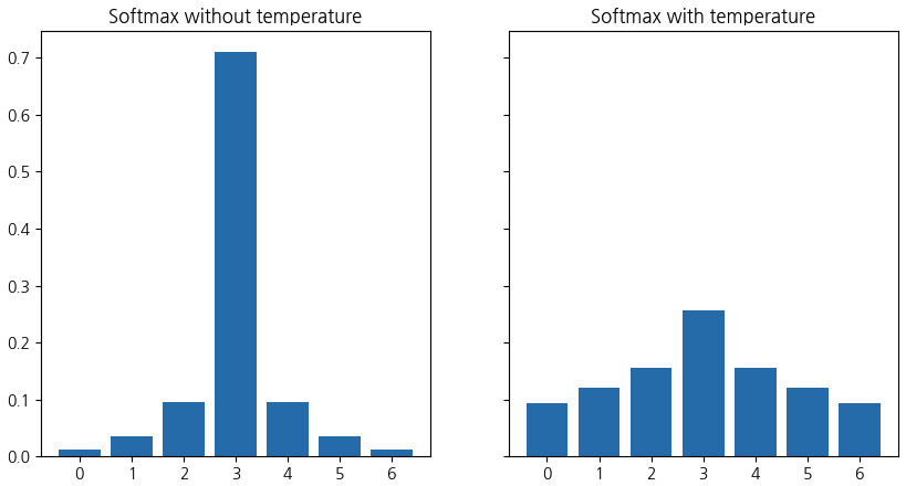 temperature값이 크다면 평평하게 작다면 더 뾰족한 분포를 얻을 수 있다.