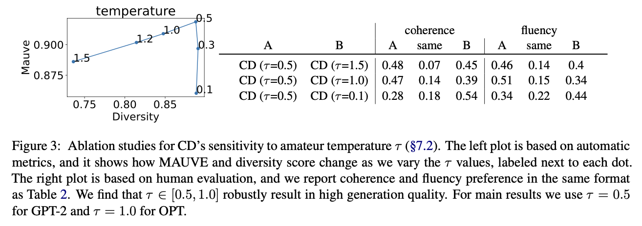 또한 에 대한 ablation test도 진행했는데, 가 0.5-1.5 사이에 있을 수록 Amateur LM이 spike한 distribution을 가지게 되면서 contrastive decoding의 성능을 극대화할 수 있다고 한다.