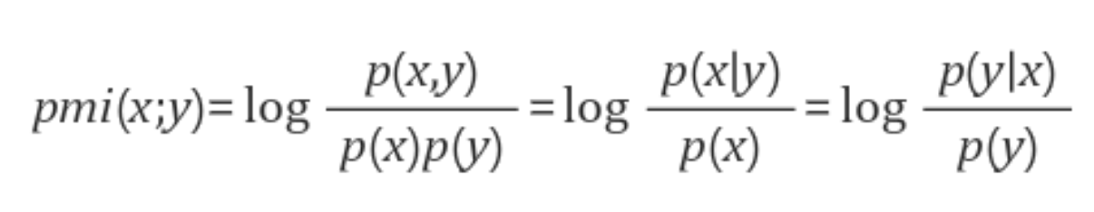 위에 보이는 것처럼 PMI Score는 두 사건이 독립이면 0의 값을 가지지만, p(x) 대비 p(x|y)이 커지면 높아지게 되어 두 사건의 관련성이 높을수록 해당 점수는 높아진다.
