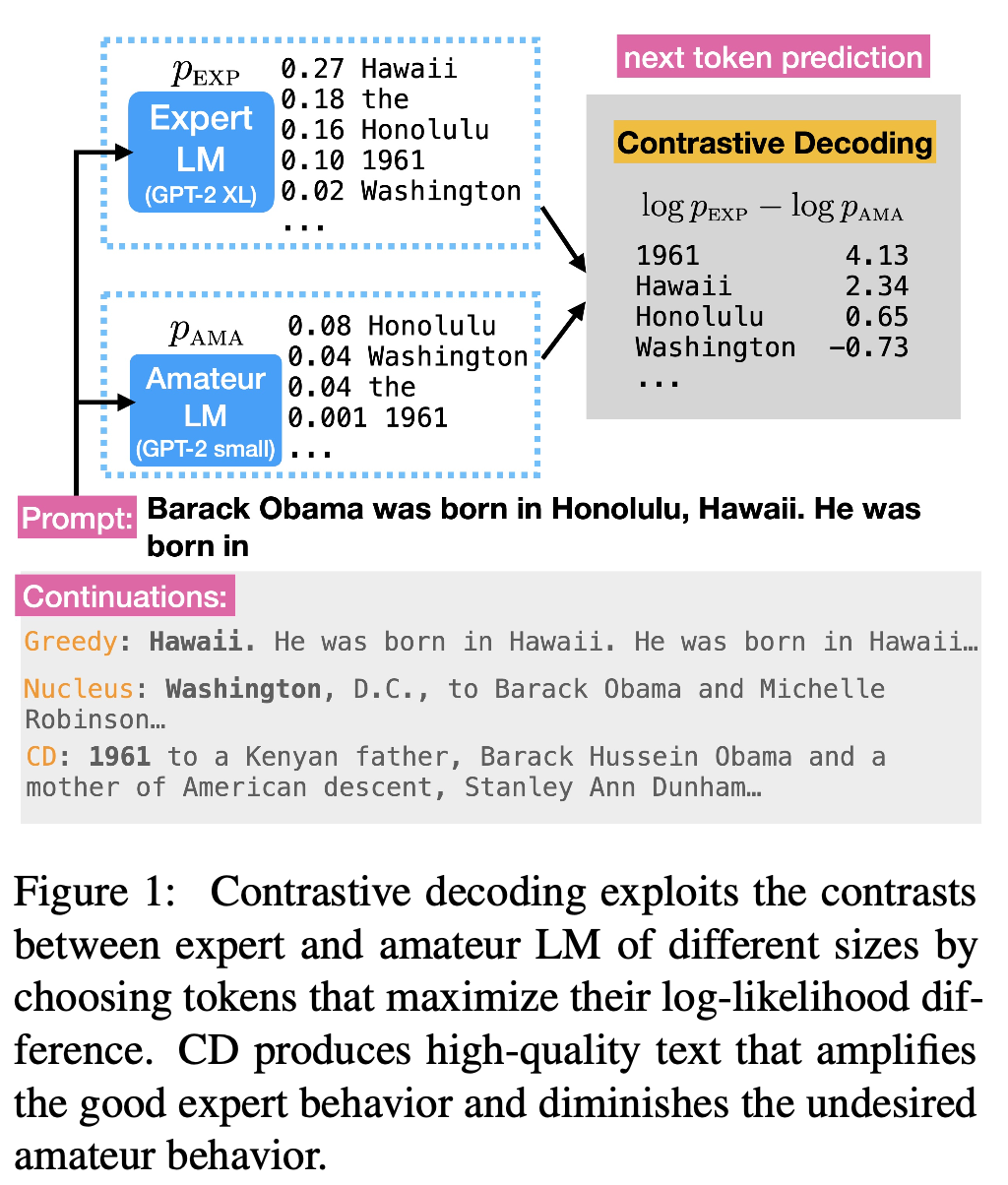 이를 해결하기 위해 저자들은 위의 그림에서 보이는것처럼 크기가 큰 Expert LM의 Token 분포에서 크기가 작은 Amateur LM의 Token 분포를 빼주는 Contrastive Decoding을 제시해, 비교적 유창한 생성이 가능한 Expert LM에서 Amateur LM의 경향성을 제거하는 방법론을 제시한다. (예시에서 Expert LM과 Amateur LM 모두 앞의 Honolulu와 Hawaii에 영햐을 받아 next token prediction에서 두 토큰에 높은 확률값을 부여했으나 contrastive decoding을 통해 상쇄되는 것을 확인할 수 있다)