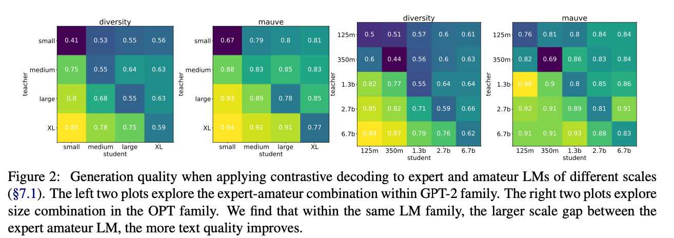제안하는 방법론은 추가적인 학습이 필요없는 방법론이며 contrastive decoding하는 LM간의 크기 차이가 커질수록 그 효과가 극대화된다고 한다.