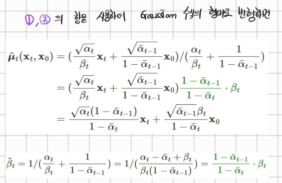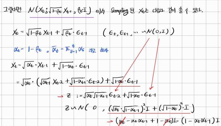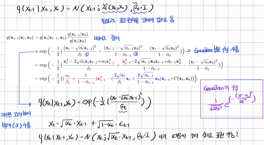 우리는 가우시안 노이즈를 더하고 제거하기 때문에 가우시안 분포의 수식을 사용해서 식을 전개한다.