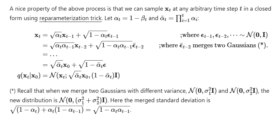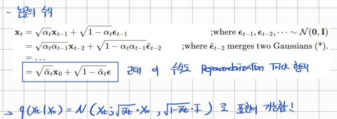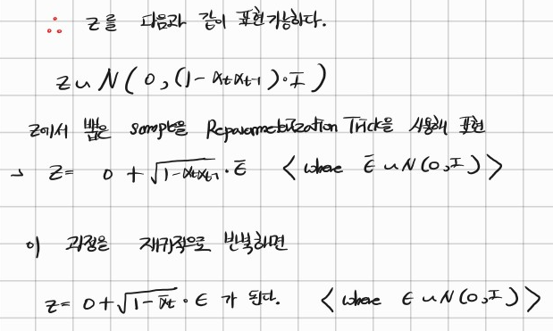 우리는 Reparameterization Trick기법을 재귀적으로 사용하여 에서 Noise를 추가하는 과정을 다음과 같이 표현할 수 있고, 이 수식을 재귀적으로 쓸 수 있다는 점을 이용하여 아래와 같이 표현이 가능하다.