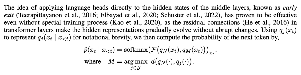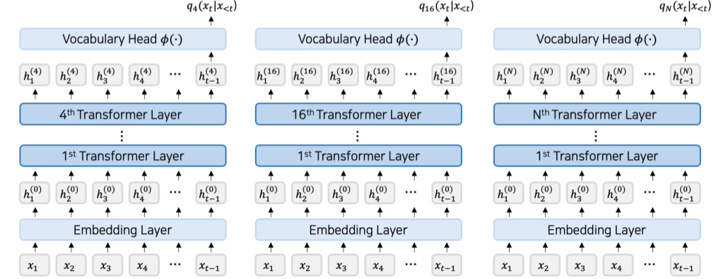 N 개의 Layer가 있다면, 각각의 Layer에서 앞서 설명한 Next Token Prediction을 뽑아내는 것을 Early Exit이라 합니다.